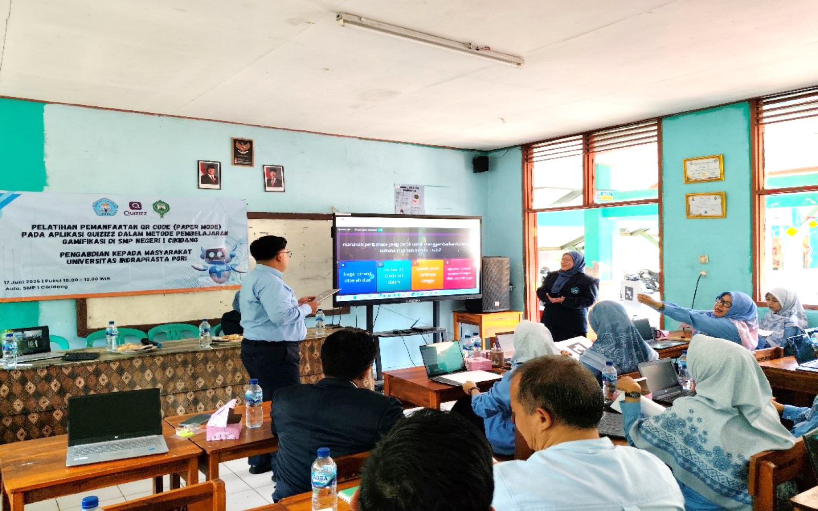 Universitas Indraprasta PGRI mengadakan program pengabdian kepada masyarakat berupa pelatihan pemanfaatan QR Code (Paper Mode) pada aplikasi Quizizz dalam metode pembelajaran gamifikasi di SMP Negeri 1 Cikidang, Senin (17/6/2025).